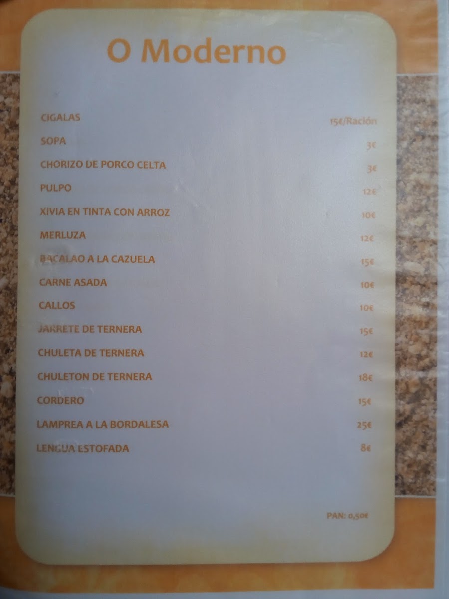 Welcome to El Moderno, nestled in the heart of Oza dos Ríos, A Coruña. This traditional restaurant holds over 40 years of culinary heritage, offering a menu that celebrates Galician cuisine. Among the highlights, the callos take center stage — a carefully crafted dish featuring tender tripe, rich in flavor and spices, making it a must-try for any visitor. Guests rave about the asada con patatas, a savory roasted meat paired with perfectly cooked potatoes that leaves a lasting impression.